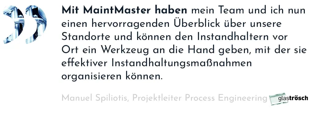 Wir haben uns für MaintMaster entschieden, weil die Werkzeuge flexibel sind, die Kundenbetreuung gut ist und MaintMaster gewillt ist, unsere Anregungen aufzugreifen, um die Qualität weiter zu verbessern. Manuel Medina, Engineering Projects Manager, Gränges Americas Inc Mehr erfahren
