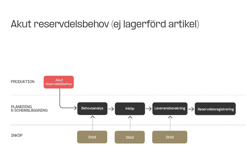 Processkartan nedan visar ansvarsfördelning och förfaringssätt för registrering och inköp av reservdelar vid ett akut behov. Ansvaret för ett akut inköp ligger hos underhållsledning eller avdelningschef. Faktainsamling och beställning delegeras till underhållstekniker som kan åberopa stöd från underhållsledning.