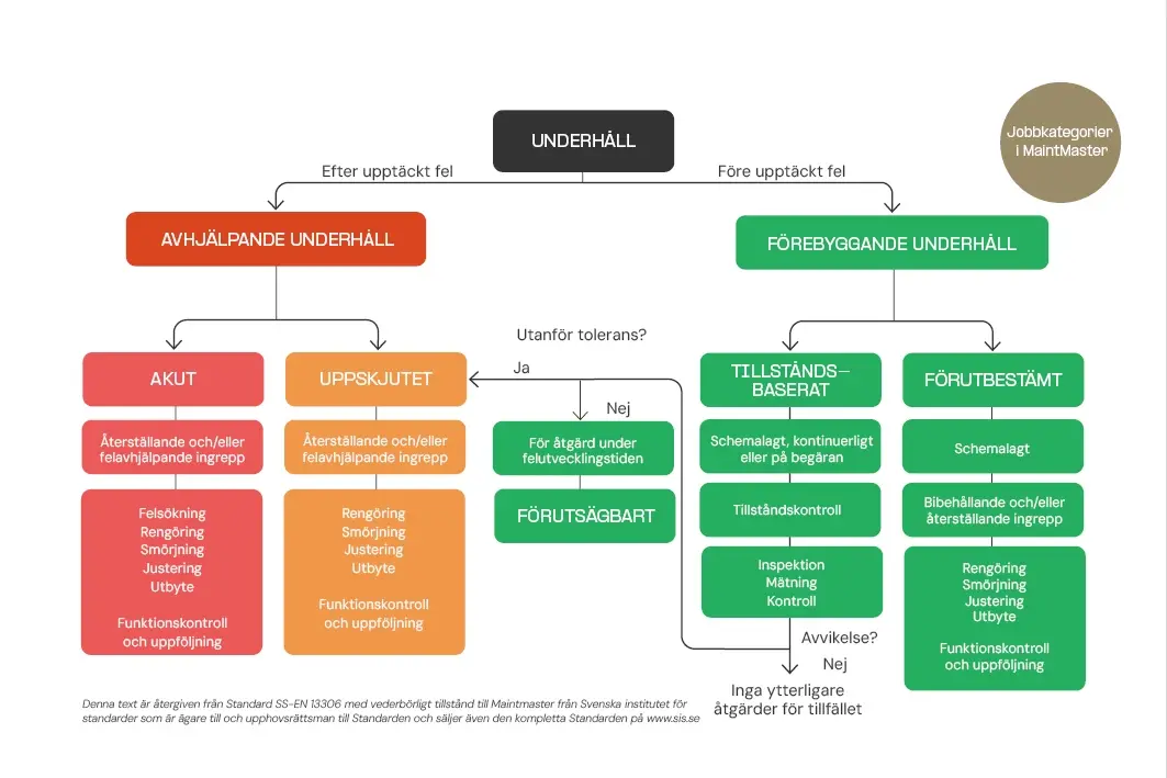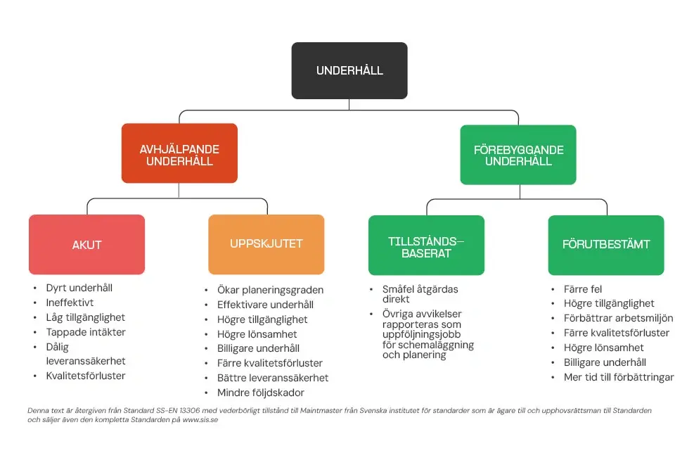 Allt underhållsarbete som syftar till att vidmakthålla eller förbättra driftsäkerheten på en maskin eller utrustning delas enligt standard SS-EN 13306 upp i tre arbetstyper, Avhjälpande, Förebyggande och Förbättrande underhåll.